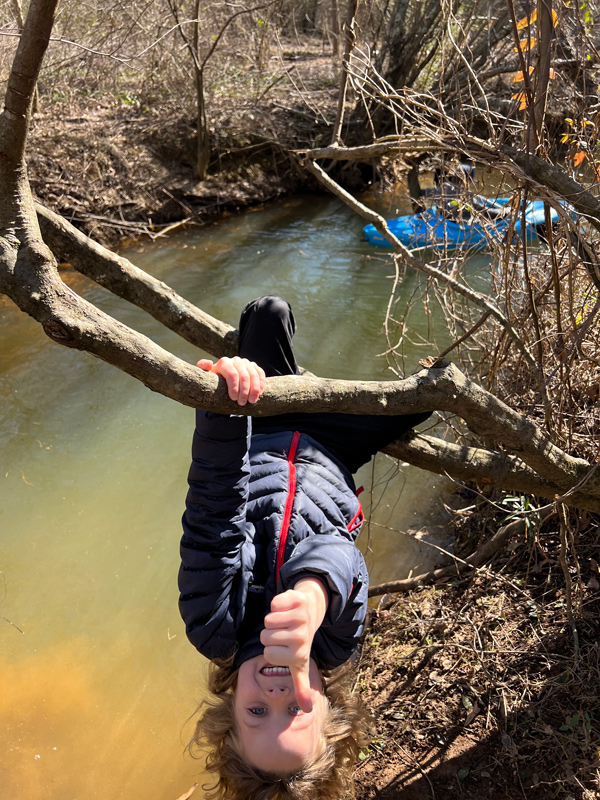 Meanwhile, I watched with a deep sense of satisfaction knowing that my boys have the freedom to explore, get creative and come up with solutions on their own to their own boy-world problems. I watched the dog frolic around and eventually jump in the creek (didn’t see that coming, right?) and the younger boy hang upside down on a branch above the creek in joy. It was a perfect mini-adventure and to that I am thankful.