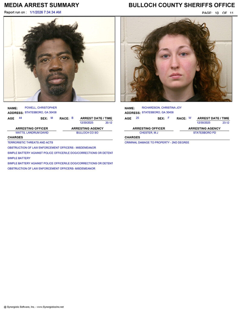 These records are matters of public information provided by the Bulloch County Sheriff’s Office. Booking reports are details of arrests only. All persons below are considered to be innocent unless proven otherwise in a court of law.