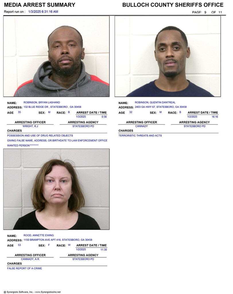 These records are matters of public information provided by the Bulloch County Sheriff’s Office. Booking reports are details of arrests only. All persons below are considered to be innocent unless proven otherwise in a court of law.