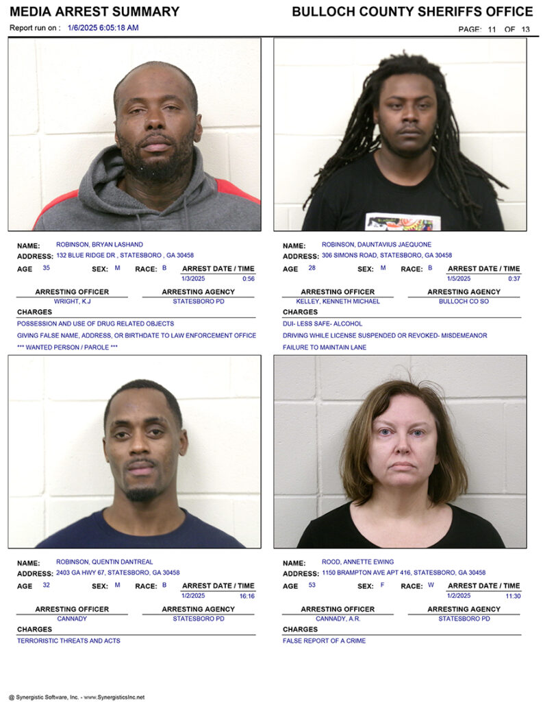 These records are matters of public information provided by the Bulloch County Sheriff’s Office. Booking reports are details of arrests only. All persons below are considered to be innocent unless proven otherwise in a court of law.