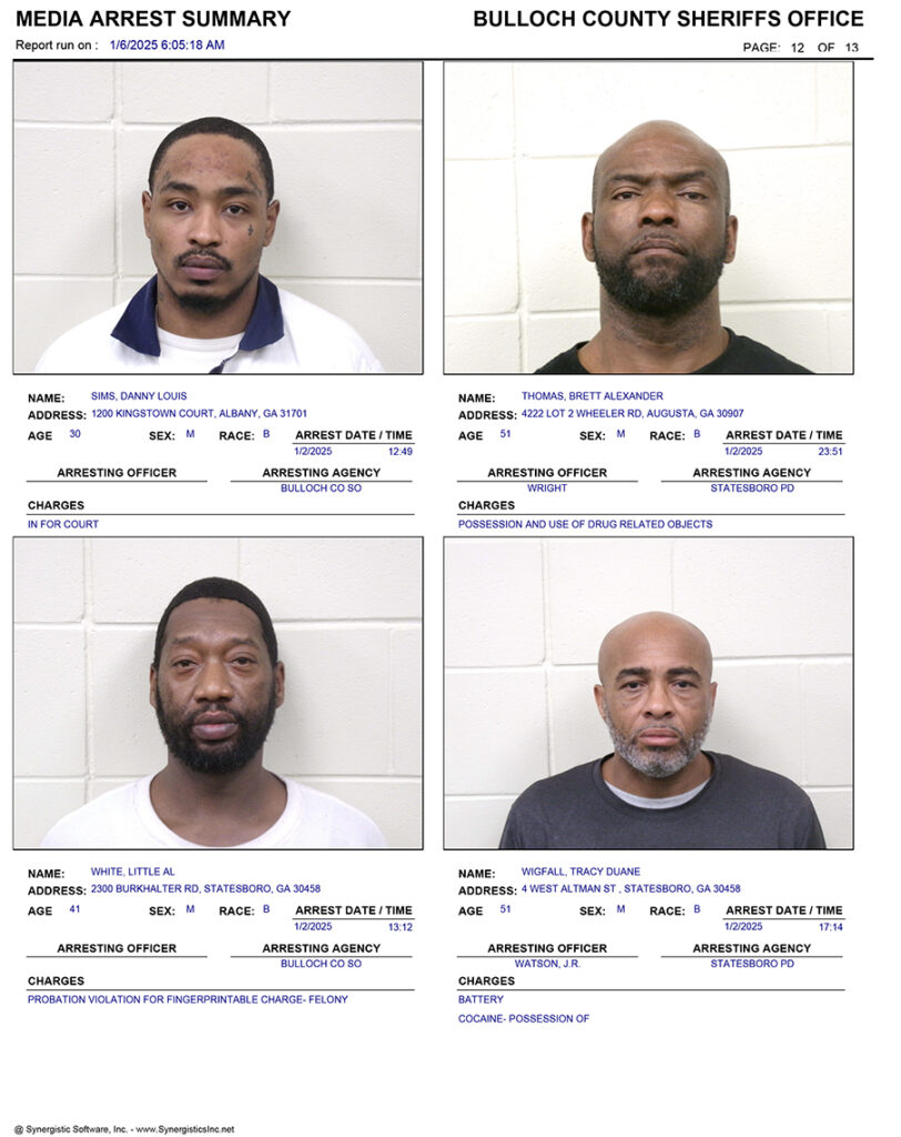 These records are matters of public information provided by the Bulloch County Sheriff’s Office. Booking reports are details of arrests only. All persons below are considered to be innocent unless proven otherwise in a court of law.