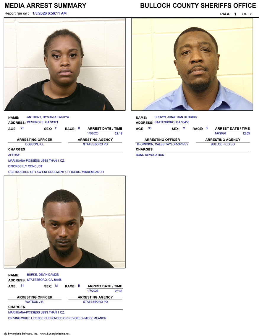 These records are matters of public information provided by the Bulloch County Sheriff’s Office. Booking reports are details of arrests only. All persons below are considered to be innocent unless proven otherwise in a court of law.