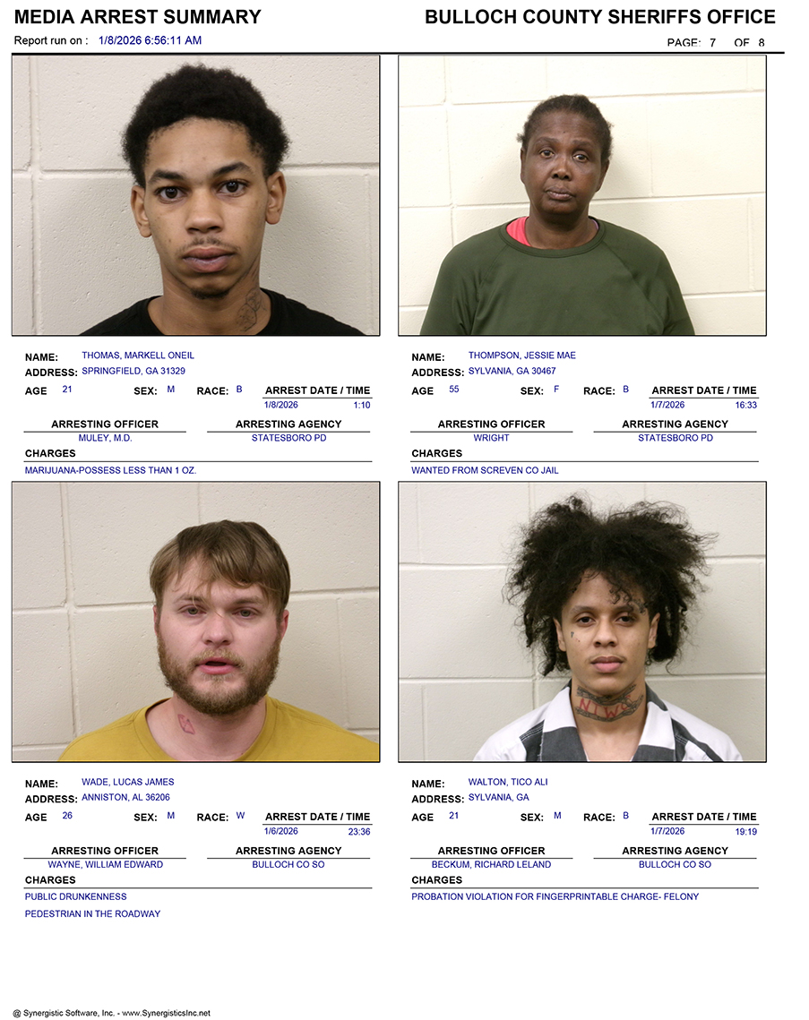 These records are matters of public information provided by the Bulloch County Sheriff’s Office. Booking reports are details of arrests only. All persons below are considered to be innocent unless proven otherwise in a court of law.