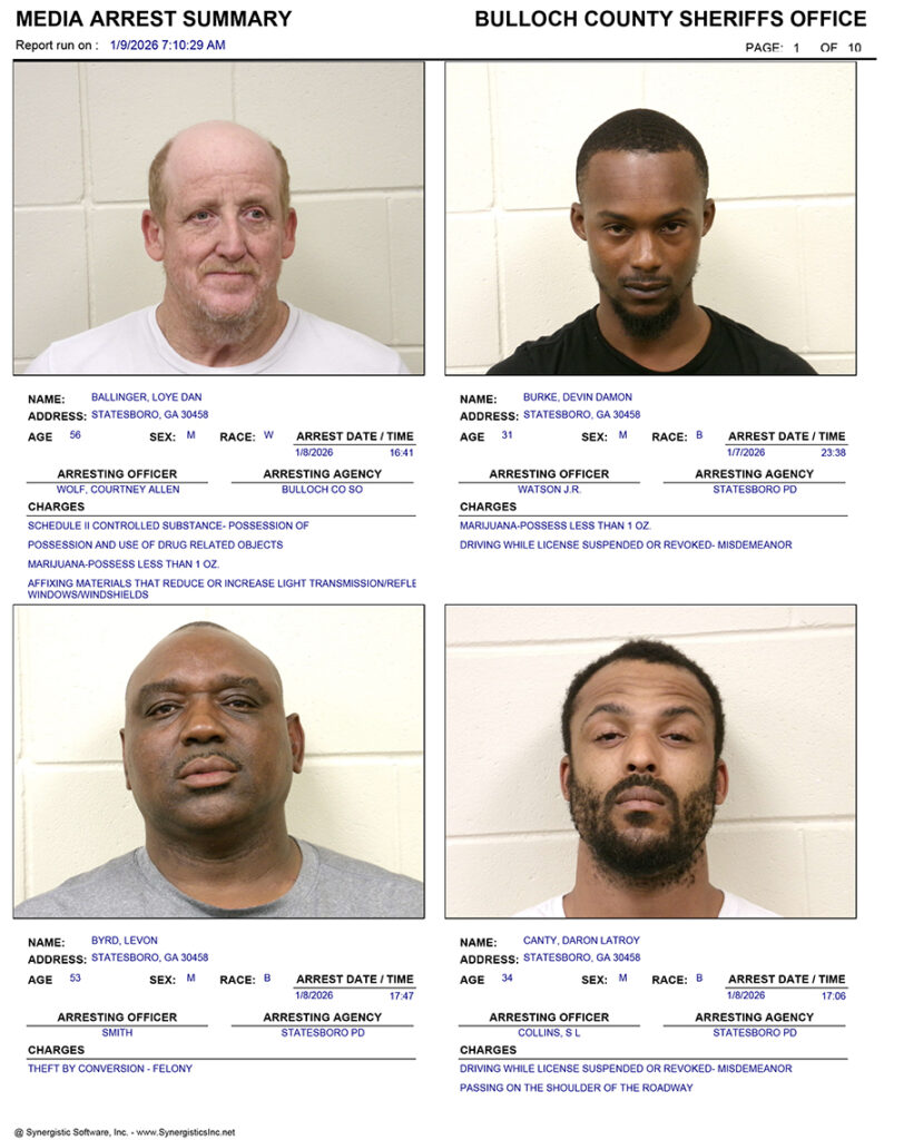 These records are matters of public information provided by the Bulloch County Sheriff’s Office. Booking reports are details of arrests only. All persons below are considered to be innocent unless proven otherwise in a court of law.