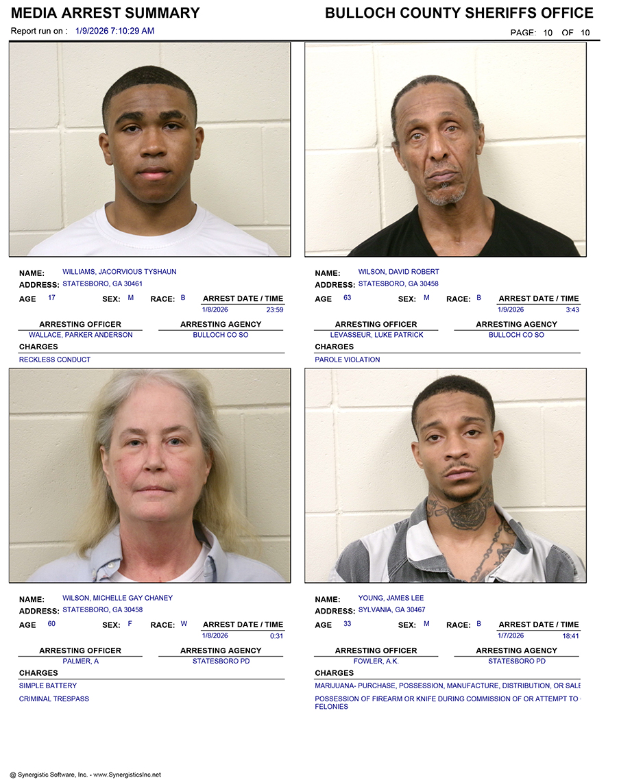These records are matters of public information provided by the Bulloch County Sheriff’s Office. Booking reports are details of arrests only. All persons below are considered to be innocent unless proven otherwise in a court of law.
