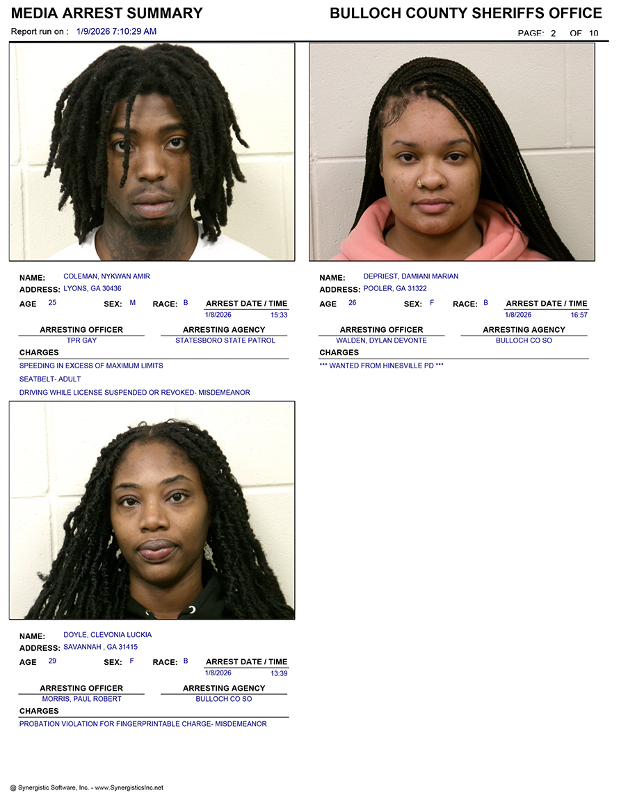 These records are matters of public information provided by the Bulloch County Sheriff’s Office. Booking reports are details of arrests only. All persons below are considered to be innocent unless proven otherwise in a court of law.