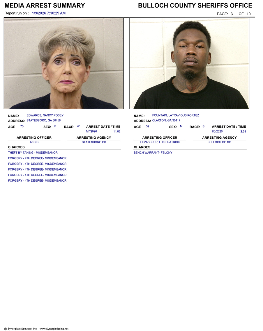 These records are matters of public information provided by the Bulloch County Sheriff’s Office. Booking reports are details of arrests only. All persons below are considered to be innocent unless proven otherwise in a court of law.