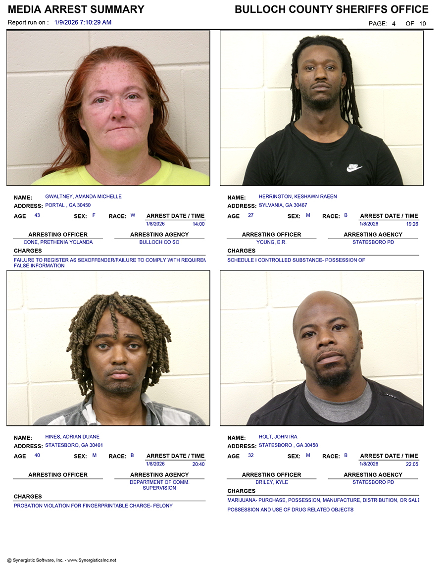 These records are matters of public information provided by the Bulloch County Sheriff’s Office. Booking reports are details of arrests only. All persons below are considered to be innocent unless proven otherwise in a court of law.