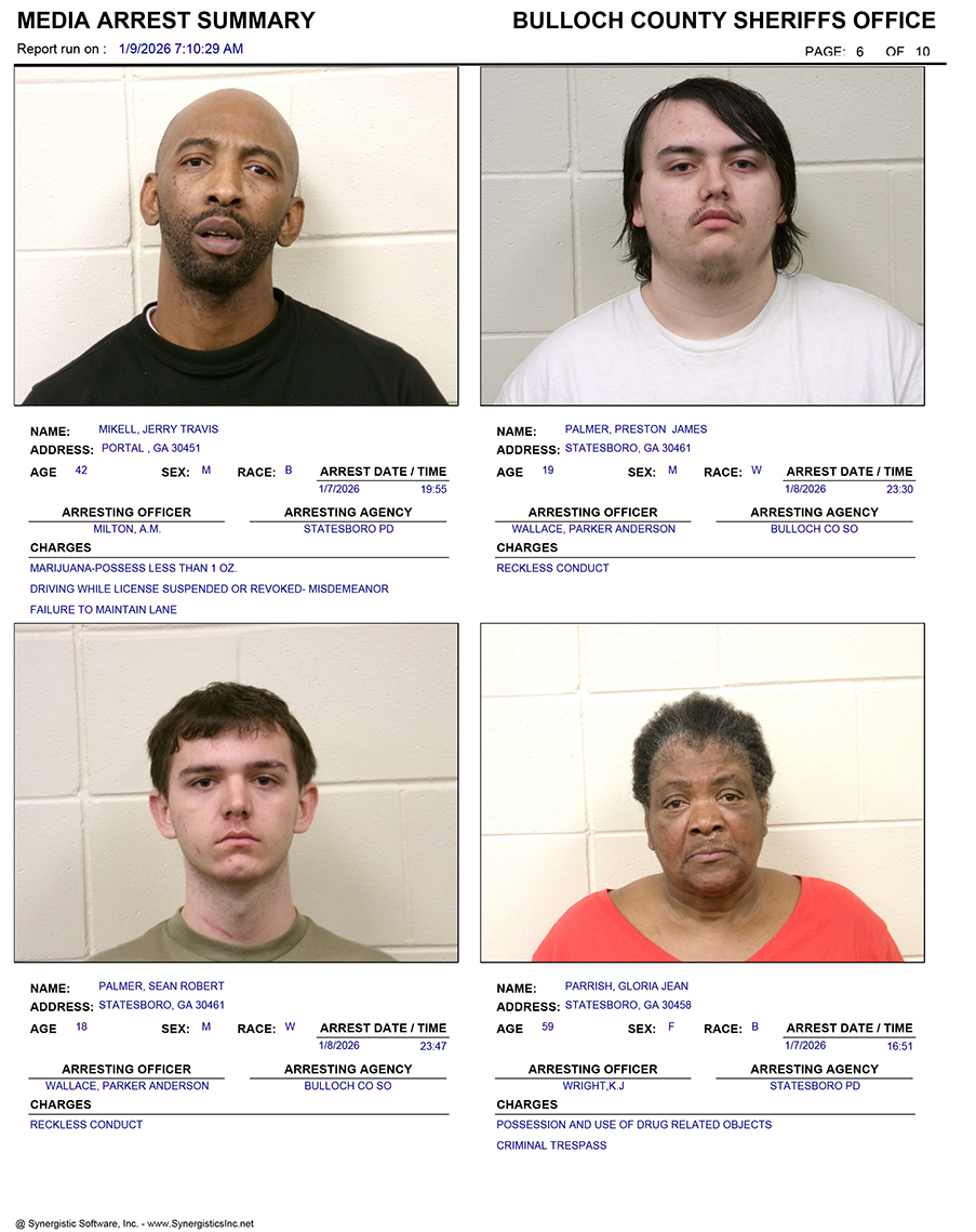 These records are matters of public information provided by the Bulloch County Sheriff’s Office. Booking reports are details of arrests only. All persons below are considered to be innocent unless proven otherwise in a court of law.