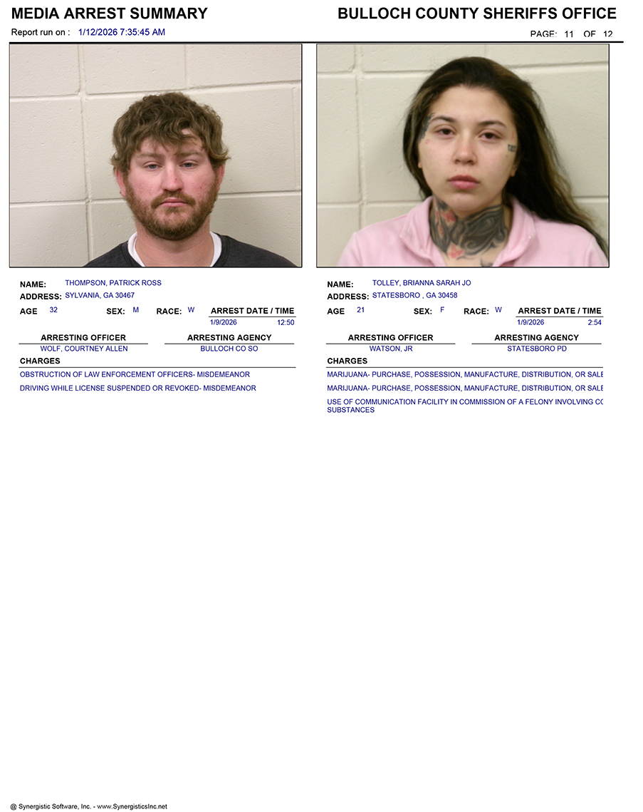 These records are matters of public information provided by the Bulloch County Sheriff’s Office. Booking reports are details of arrests only. All persons below are considered to be innocent unless proven otherwise in a court of law.