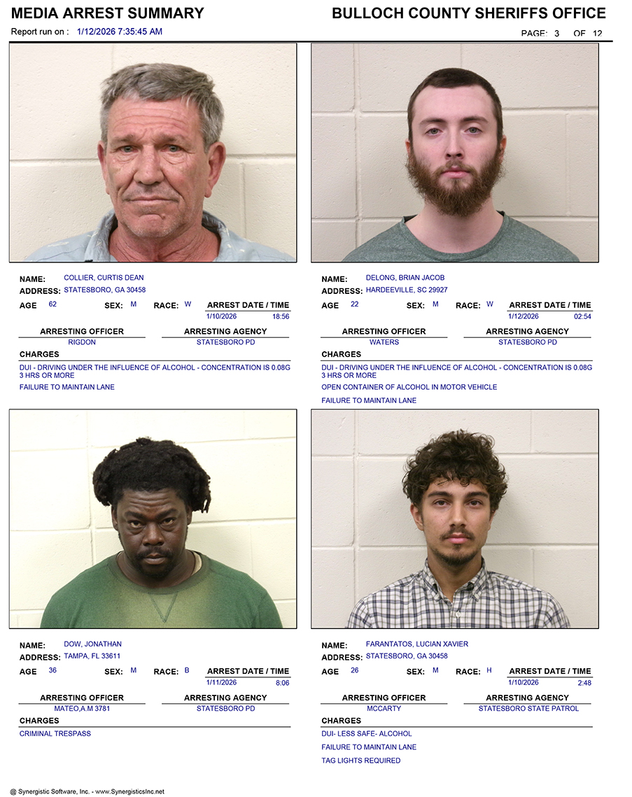 These records are matters of public information provided by the Bulloch County Sheriff’s Office. Booking reports are details of arrests only. All persons below are considered to be innocent unless proven otherwise in a court of law.