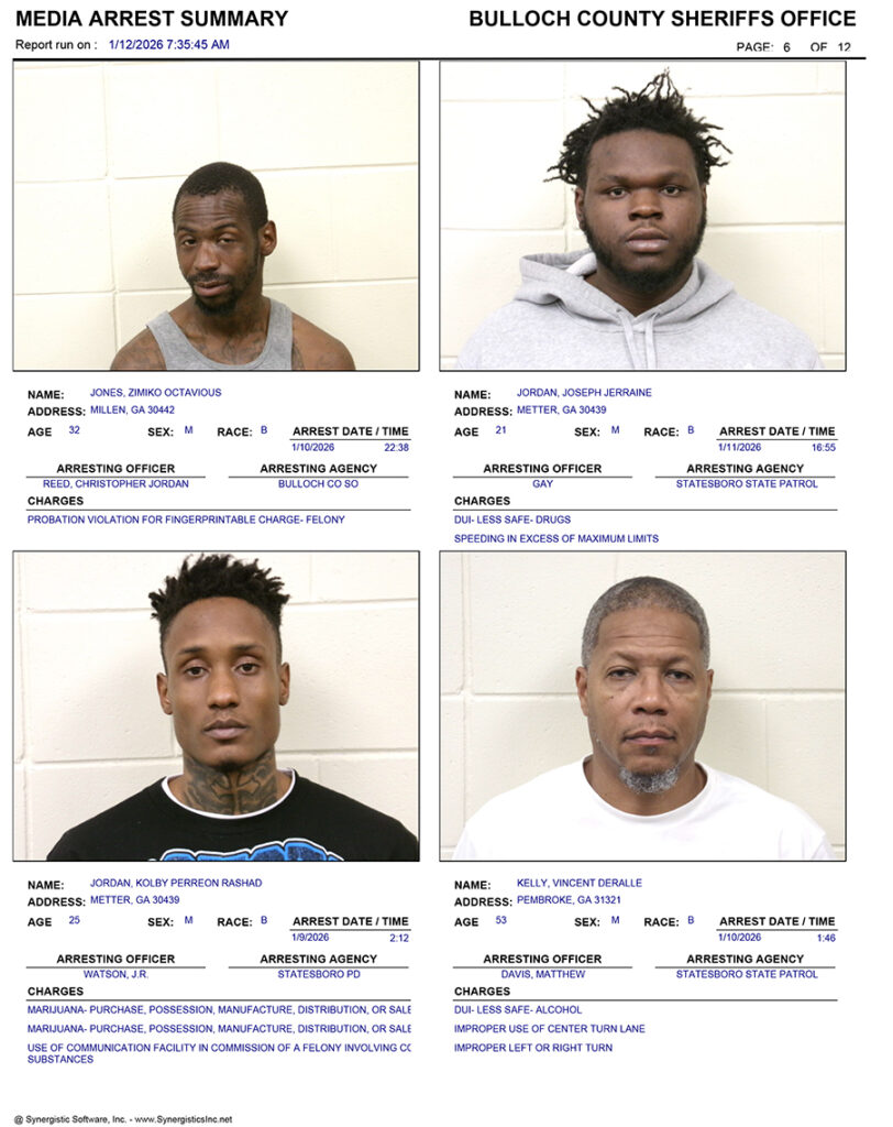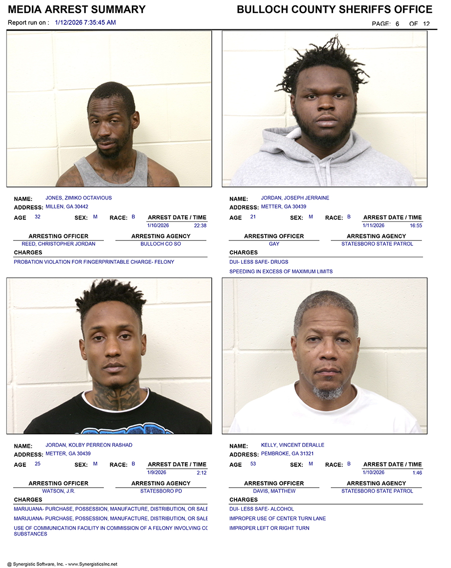 These records are matters of public information provided by the Bulloch County Sheriff’s Office. Booking reports are details of arrests only. All persons below are considered to be innocent unless proven otherwise in a court of law.