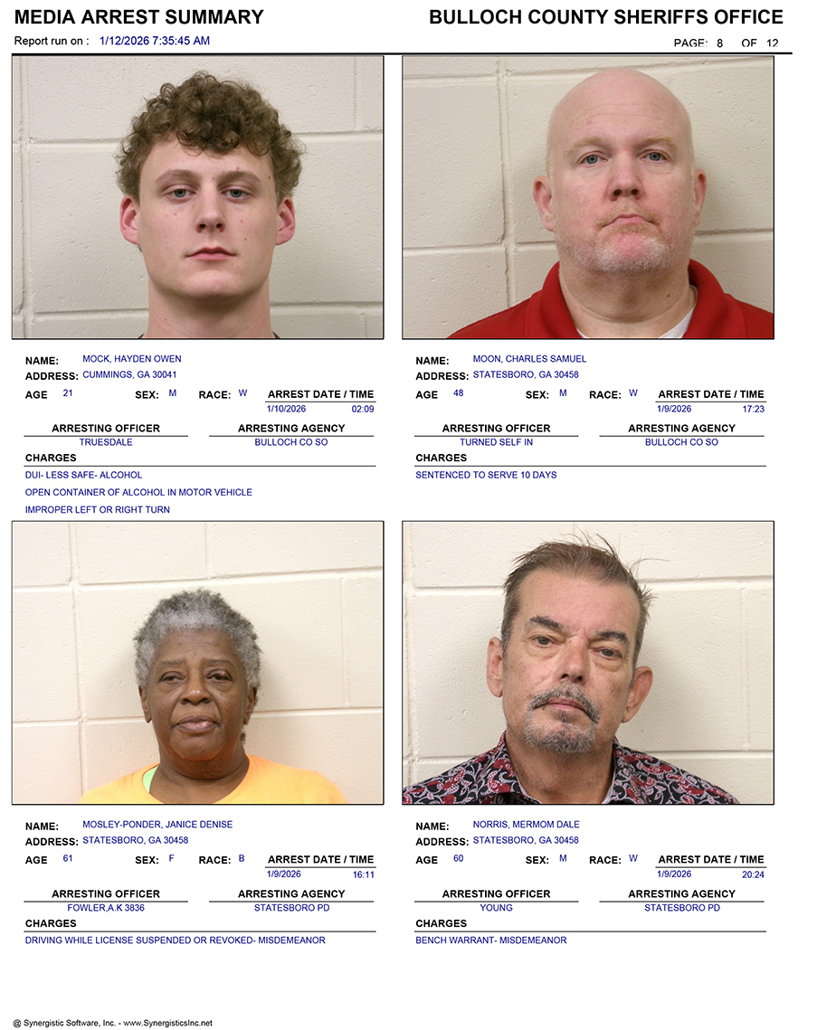 These records are matters of public information provided by the Bulloch County Sheriff’s Office. Booking reports are details of arrests only. All persons below are considered to be innocent unless proven otherwise in a court of law.