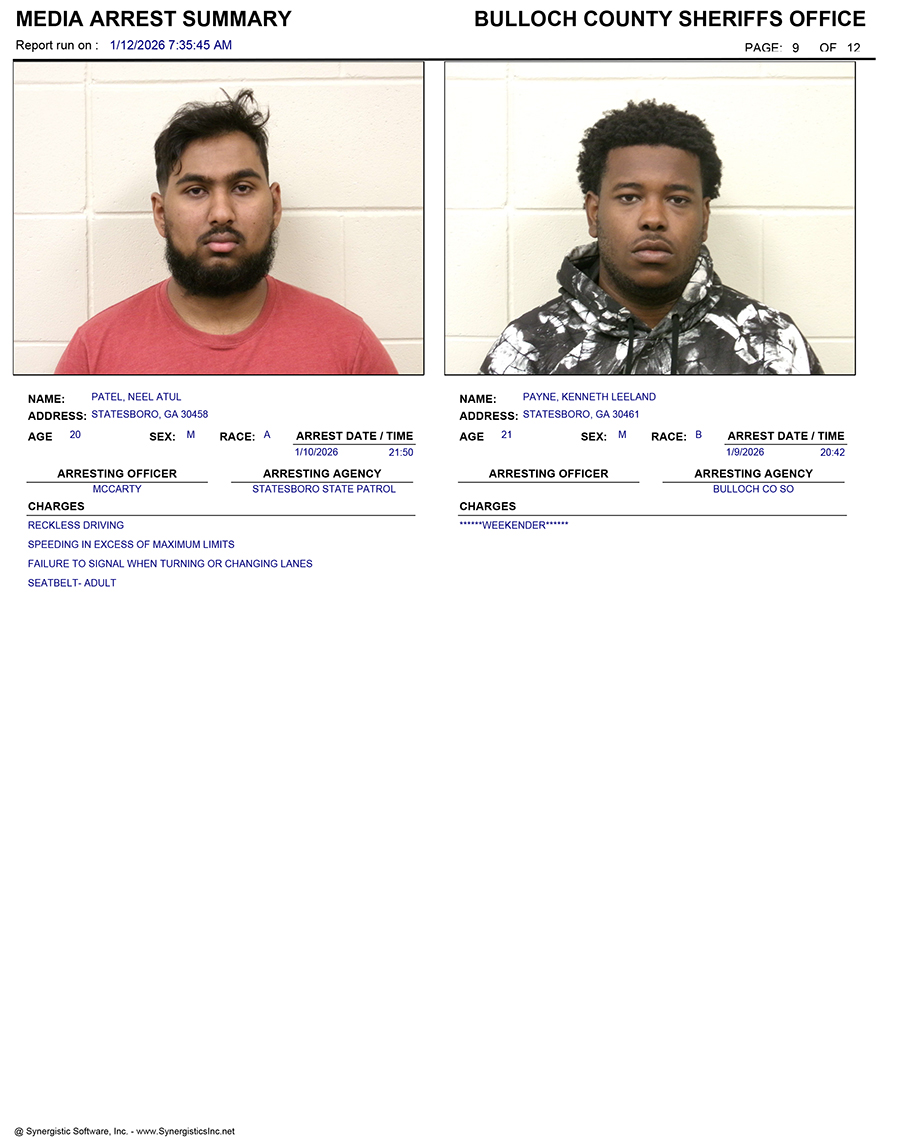 These records are matters of public information provided by the Bulloch County Sheriff’s Office. Booking reports are details of arrests only. All persons below are considered to be innocent unless proven otherwise in a court of law.