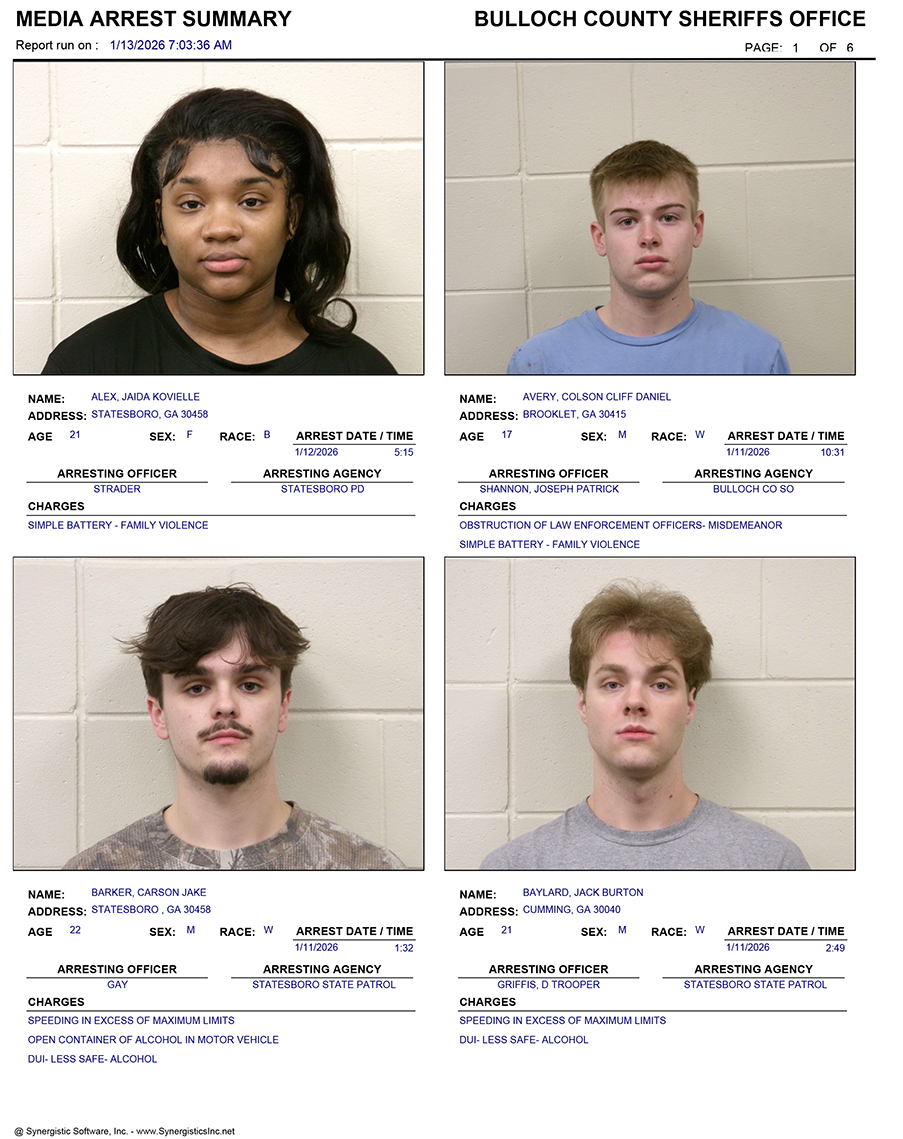 These records are matters of public information provided by the Bulloch County Sheriff’s Office. Booking reports are details of arrests only. All persons below are considered to be innocent unless proven otherwise in a court of law.