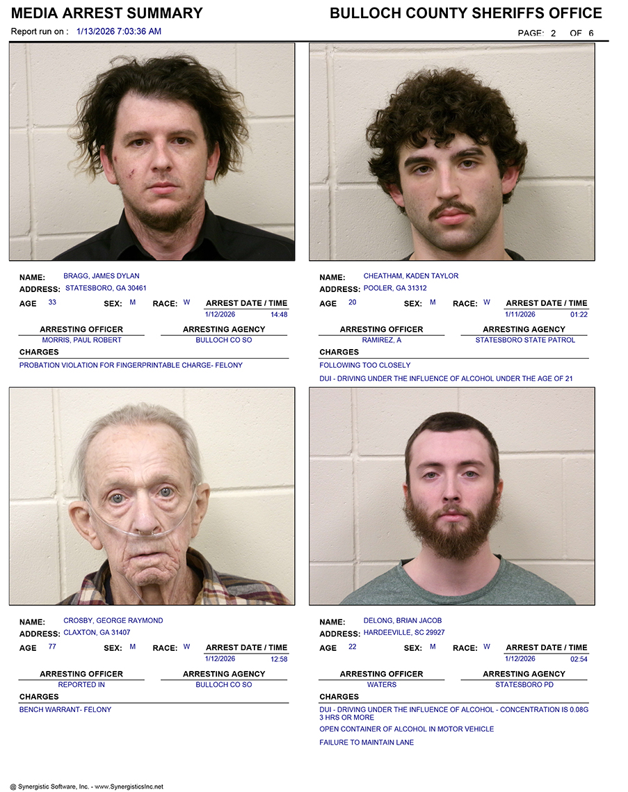 These records are matters of public information provided by the Bulloch County Sheriff’s Office. Booking reports are details of arrests only. All persons below are considered to be innocent unless proven otherwise in a court of law.