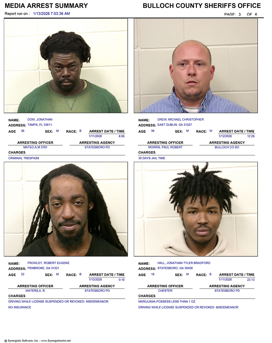 These records are matters of public information provided by the Bulloch County Sheriff’s Office. Booking reports are details of arrests only. All persons below are considered to be innocent unless proven otherwise in a court of law.