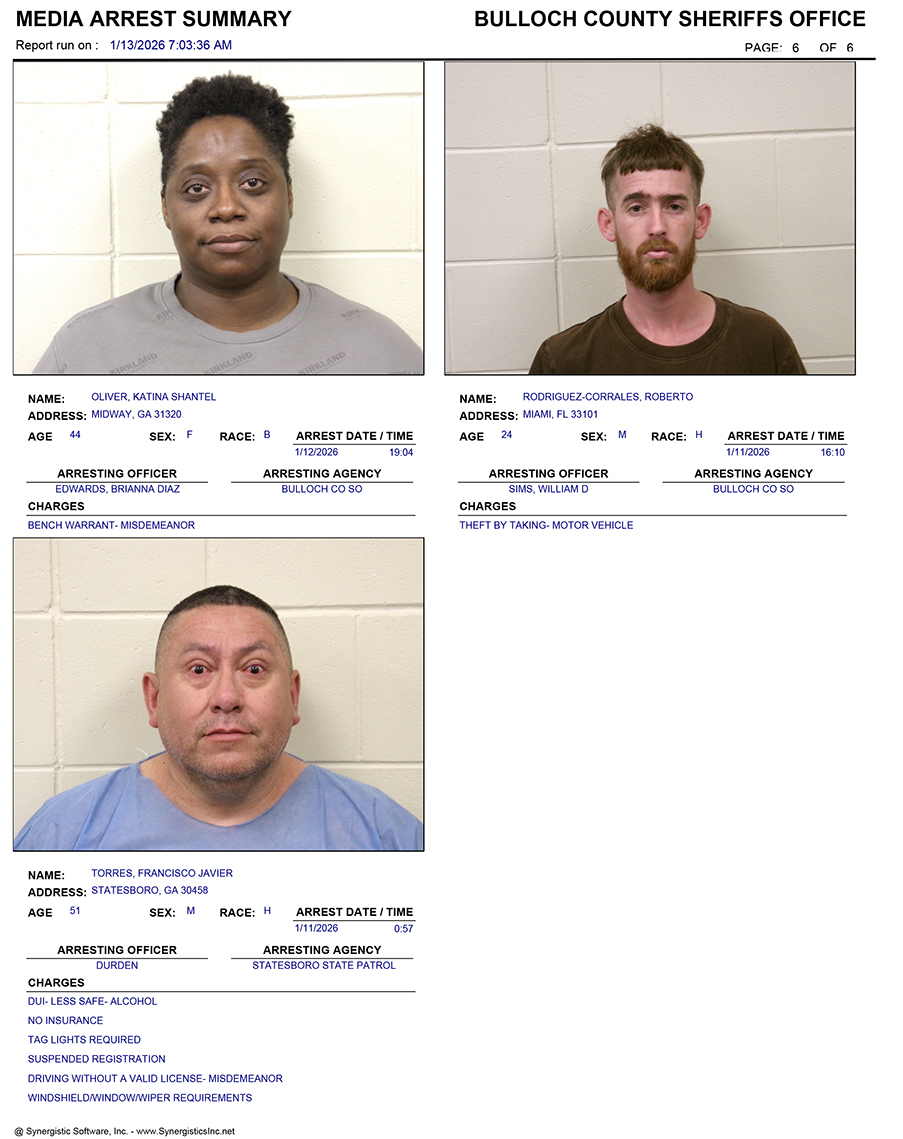 These records are matters of public information provided by the Bulloch County Sheriff’s Office. Booking reports are details of arrests only. All persons below are considered to be innocent unless proven otherwise in a court of law.