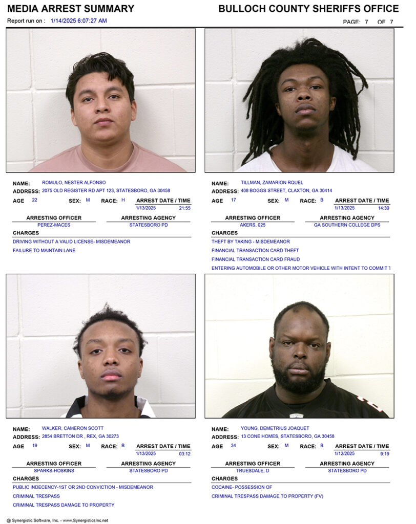 These records are matters of public information provided by the Bulloch County Sheriff’s Office. Booking reports are details of arrests only. All persons below are considered to be innocent unless proven otherwise in a court of law.