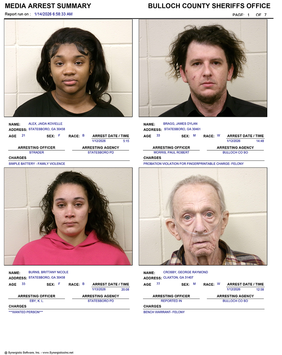 These records are matters of public information provided by the Bulloch County Sheriff’s Office. Booking reports are details of arrests only. All persons below are considered to be innocent unless proven otherwise in a court of law.