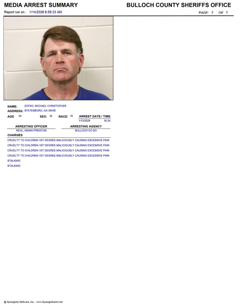 These records are matters of public information provided by the Bulloch County Sheriff’s Office. Booking reports are details of arrests only. All persons below are considered to be innocent unless proven otherwise in a court of law.