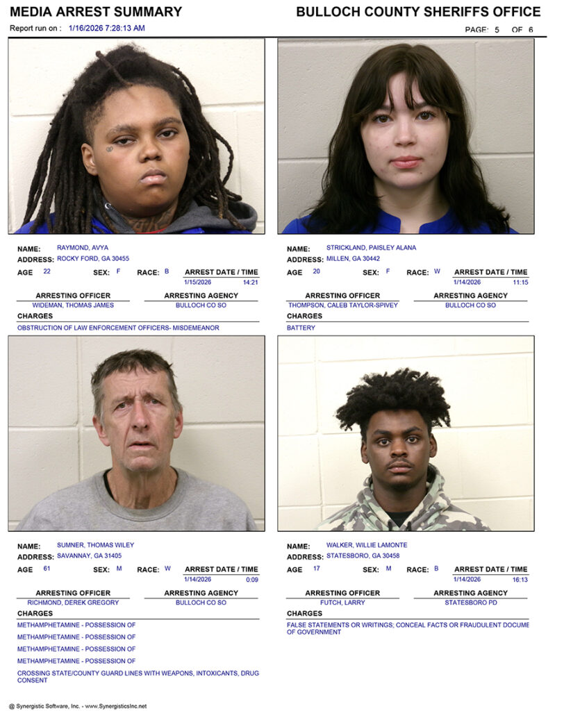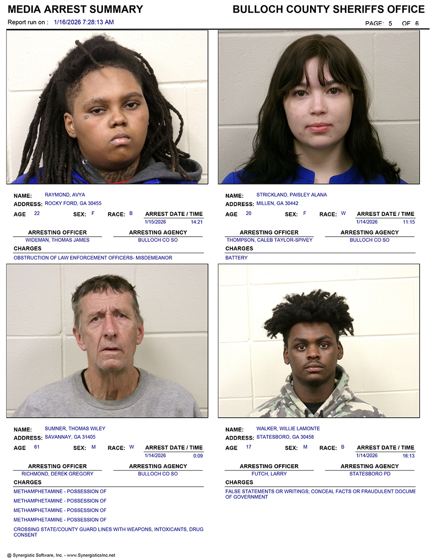 These records are matters of public information provided by the Bulloch County Sheriff’s Office. Booking reports are details of arrests only. All persons below are considered to be innocent unless proven otherwise in a court of law.