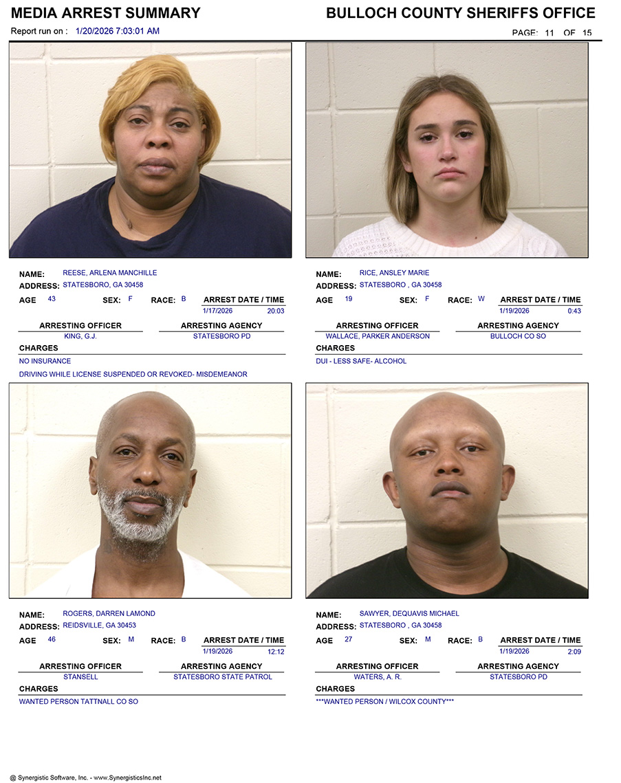 These records are matters of public information provided by the Bulloch County Sheriff’s Office. Booking reports are details of arrests only. All persons below are considered to be innocent unless proven otherwise in a court of law.