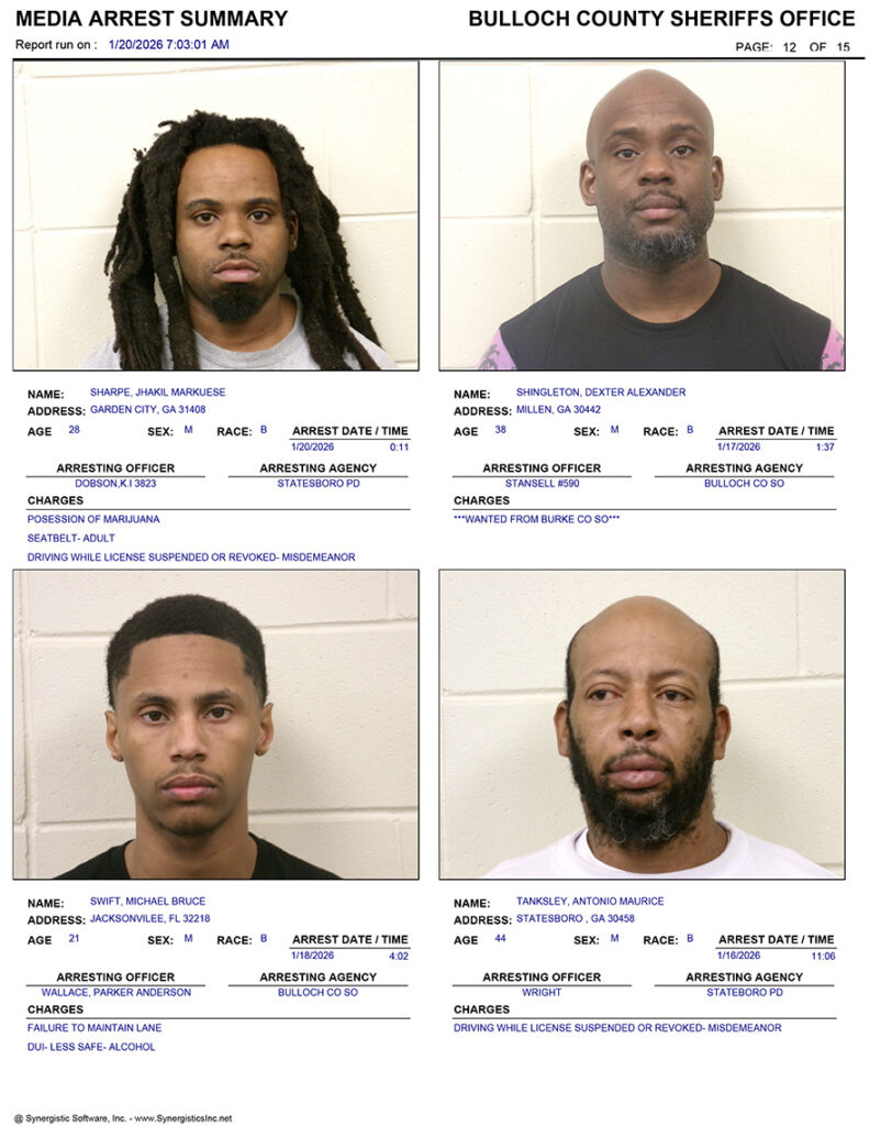These records are matters of public information provided by the Bulloch County Sheriff’s Office. Booking reports are details of arrests only. All persons below are considered to be innocent unless proven otherwise in a court of law.