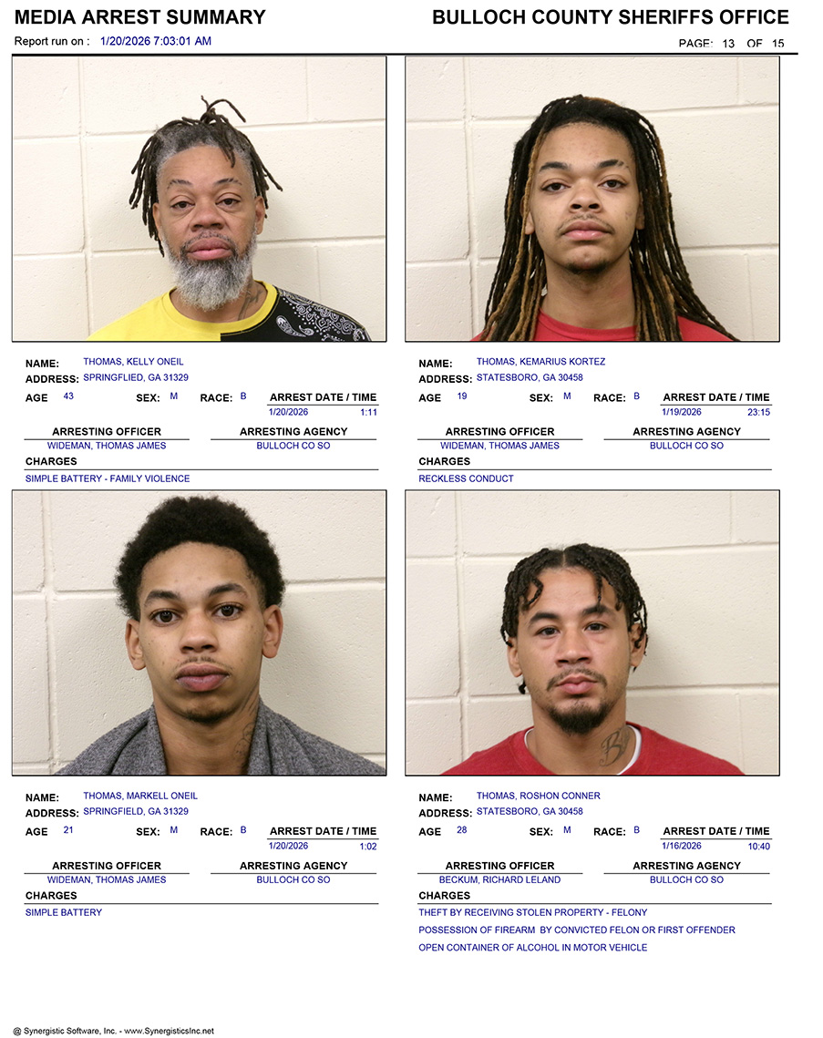 These records are matters of public information provided by the Bulloch County Sheriff’s Office. Booking reports are details of arrests only. All persons below are considered to be innocent unless proven otherwise in a court of law.