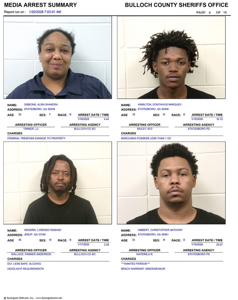 These records are matters of public information provided by the Bulloch County Sheriff’s Office. Booking reports are details of arrests only. All persons below are considered to be innocent unless proven otherwise in a court of law.