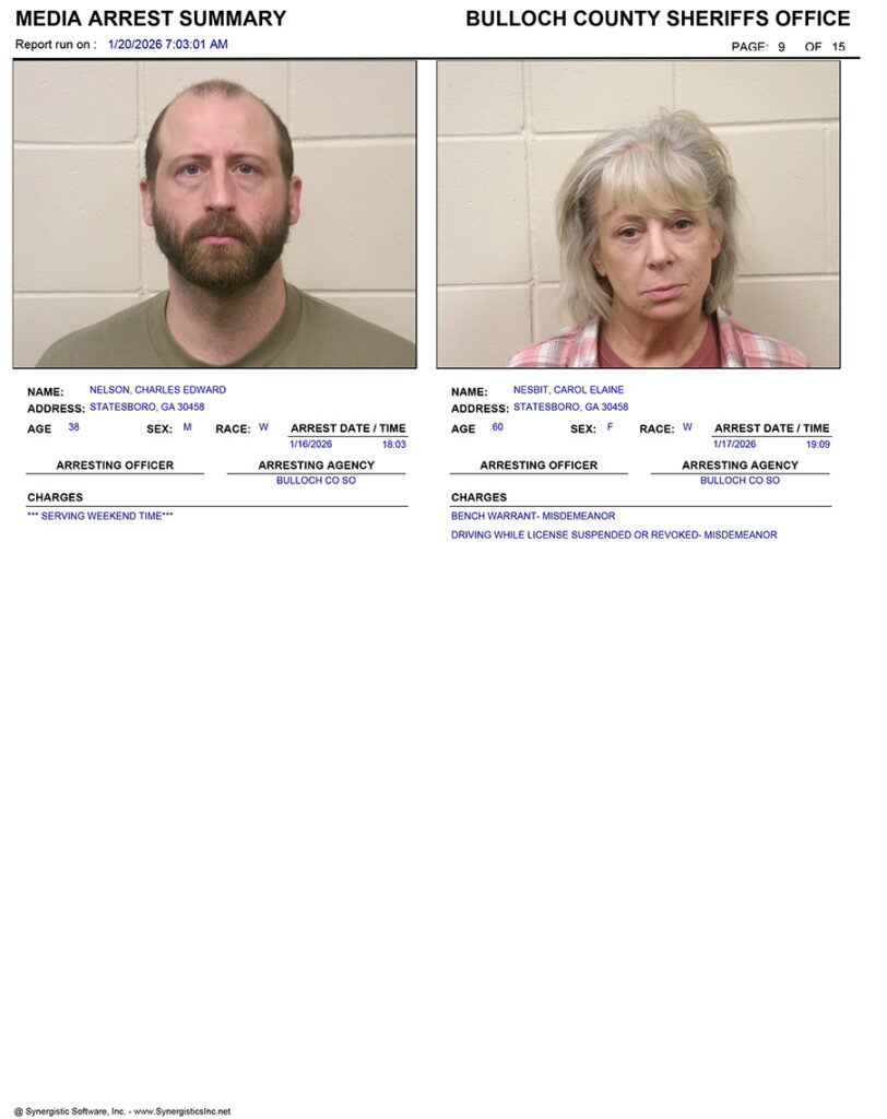 These records are matters of public information provided by the Bulloch County Sheriff’s Office. Booking reports are details of arrests only. All persons below are considered to be innocent unless proven otherwise in a court of law.
