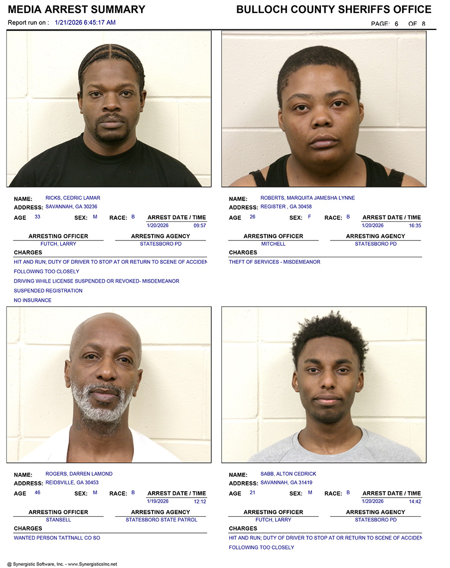These records are matters of public information provided by the Bulloch County Sheriff’s Office. Booking reports are details of arrests only. All persons below are considered to be innocent unless proven otherwise in a court of law.