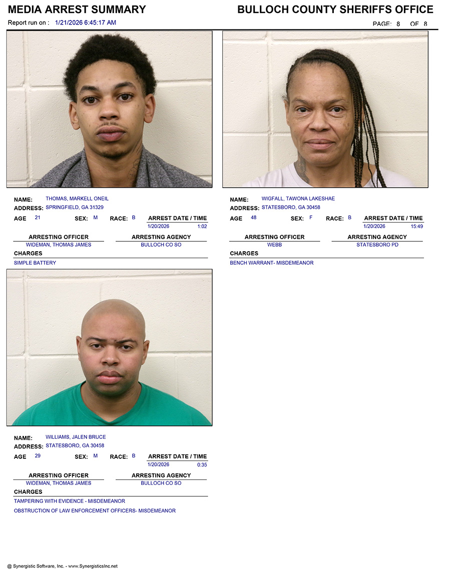 These records are matters of public information provided by the Bulloch County Sheriff’s Office. Booking reports are details of arrests only. All persons below are considered to be innocent unless proven otherwise in a court of law.