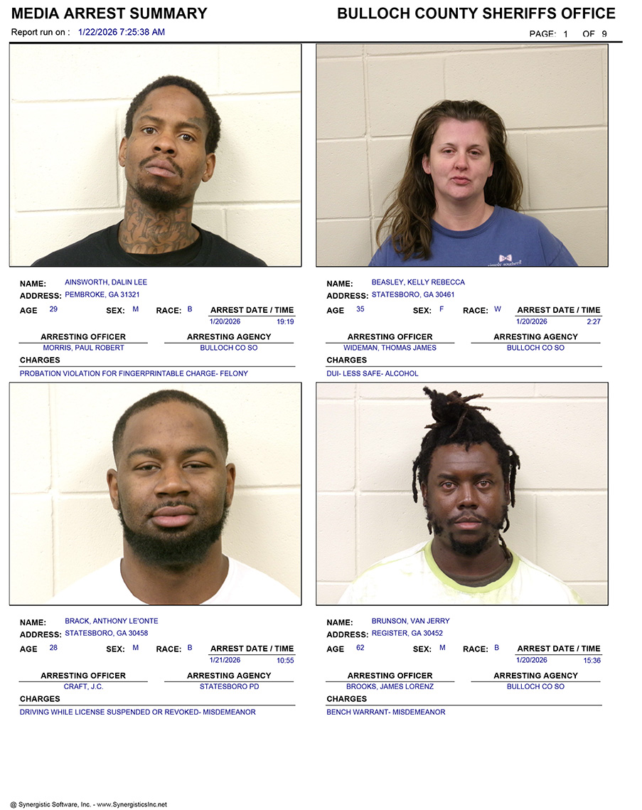 These records are matters of public information provided by the Bulloch County Sheriff’s Office. Booking reports are details of arrests only. All persons below are considered to be innocent unless proven otherwise in a court of law.