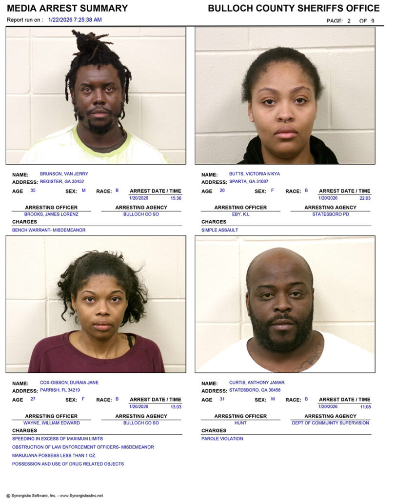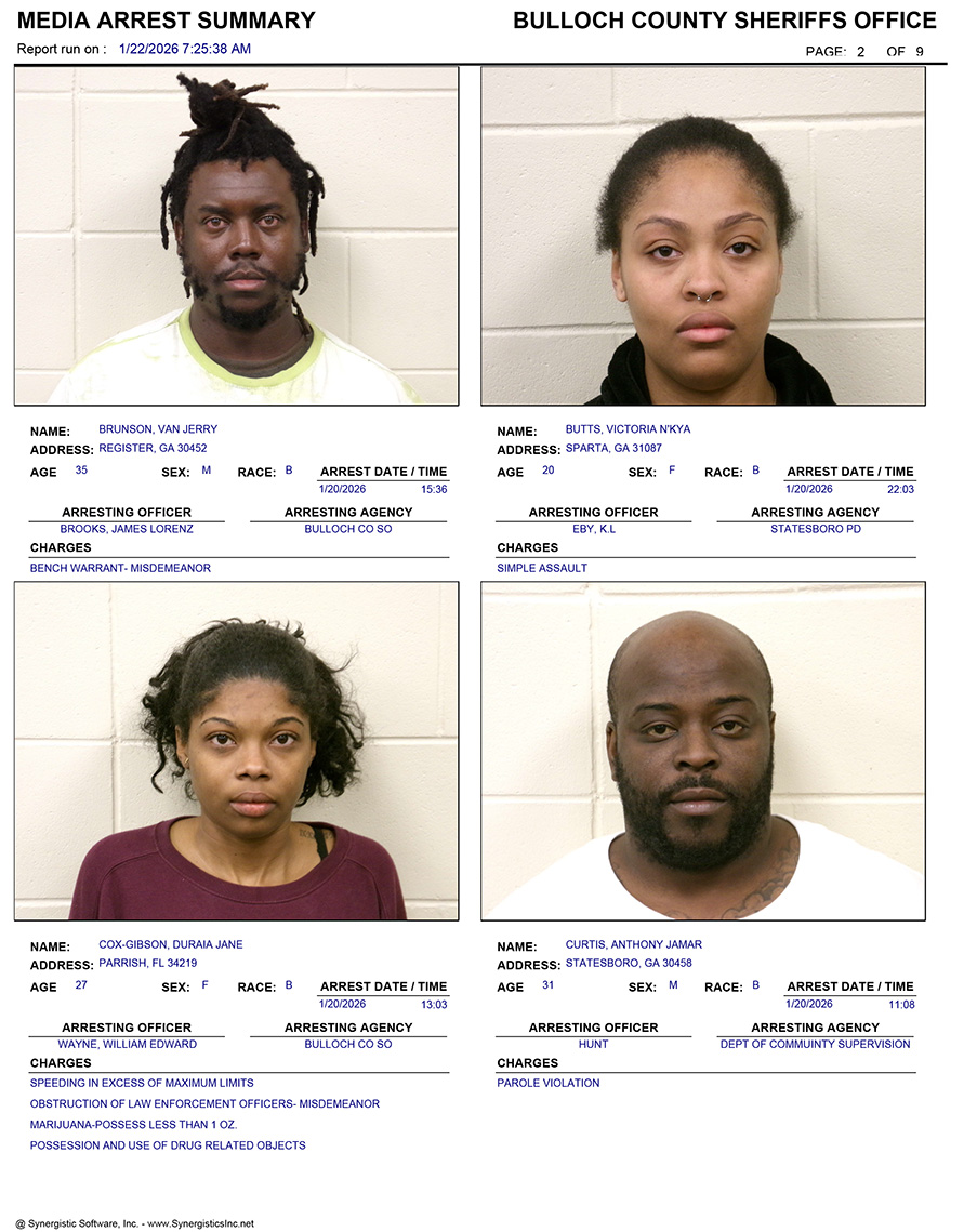 These records are matters of public information provided by the Bulloch County Sheriff’s Office. Booking reports are details of arrests only. All persons below are considered to be innocent unless proven otherwise in a court of law.