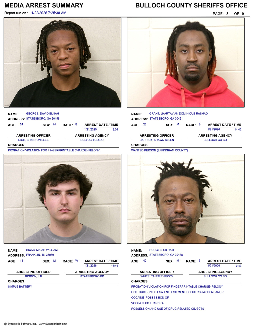 These records are matters of public information provided by the Bulloch County Sheriff’s Office. Booking reports are details of arrests only. All persons below are considered to be innocent unless proven otherwise in a court of law.