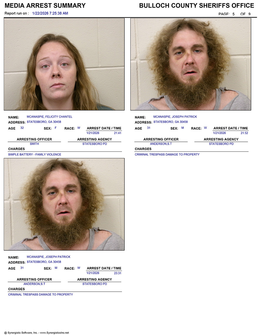 These records are matters of public information provided by the Bulloch County Sheriff’s Office. Booking reports are details of arrests only. All persons below are considered to be innocent unless proven otherwise in a court of law.