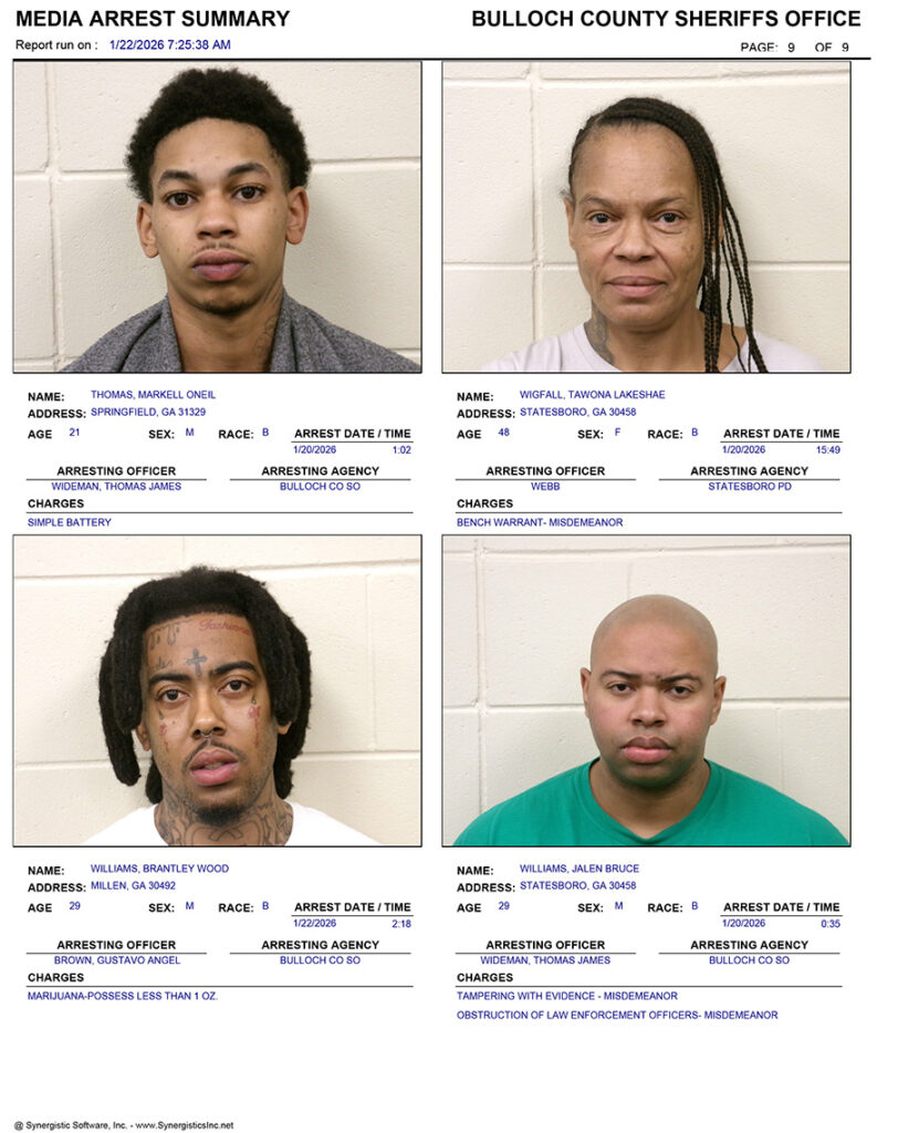These records are matters of public information provided by the Bulloch County Sheriff’s Office. Booking reports are details of arrests only. All persons below are considered to be innocent unless proven otherwise in a court of law.