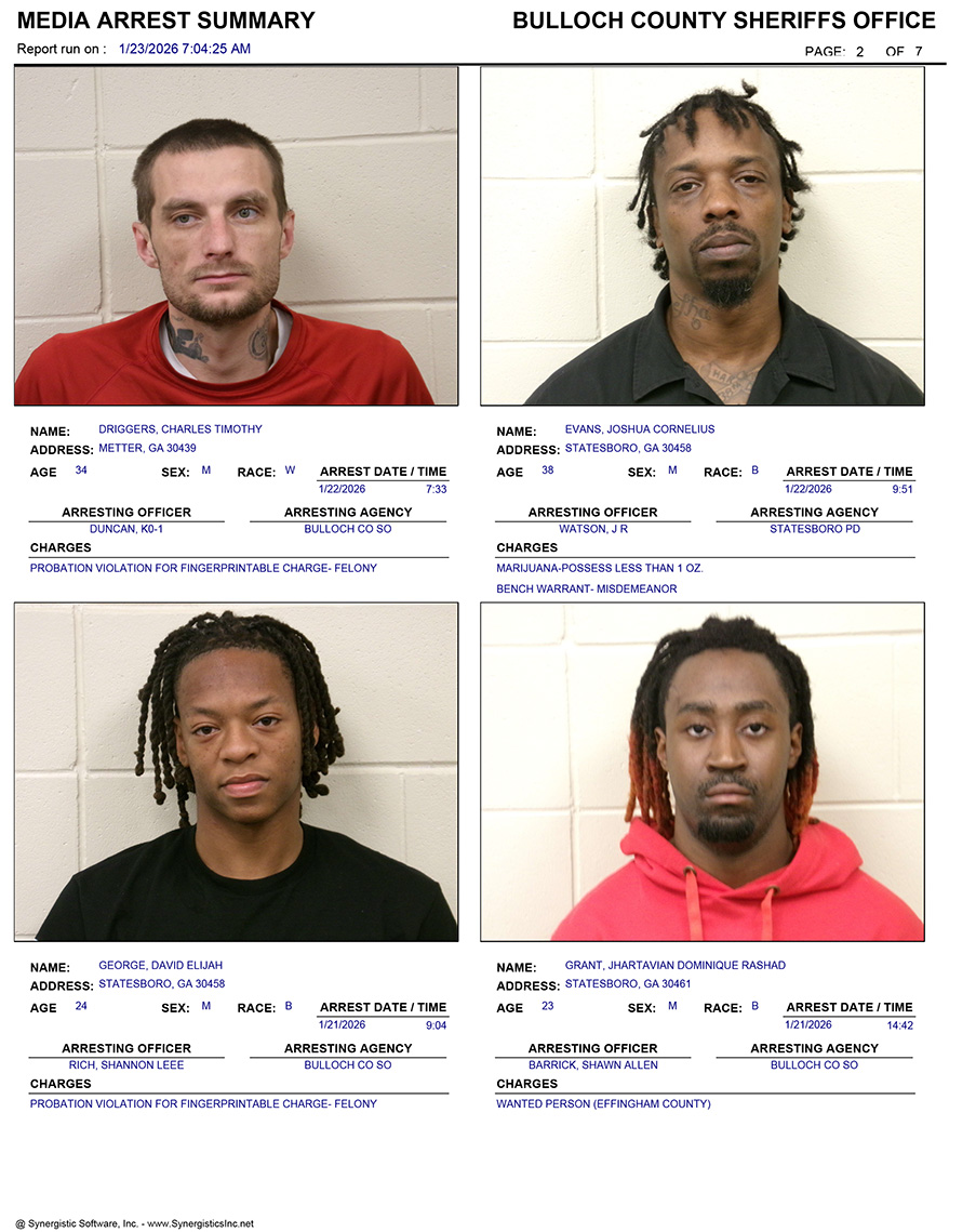 These records are matters of public information provided by the Bulloch County Sheriff’s Office. Booking reports are details of arrests only. All persons below are considered to be innocent unless proven otherwise in a court of law.