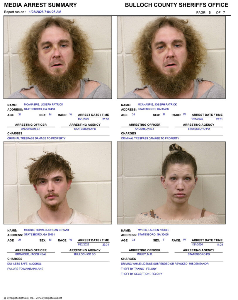These records are matters of public information provided by the Bulloch County Sheriff’s Office. Booking reports are details of arrests only. All persons below are considered to be innocent unless proven otherwise in a court of law.