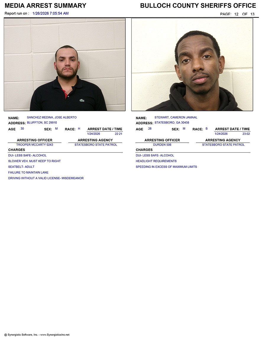 These records are matters of public information provided by the Bulloch County Sheriff’s Office. Booking reports are details of arrests only. All persons below are considered to be innocent unless proven otherwise in a court of law.