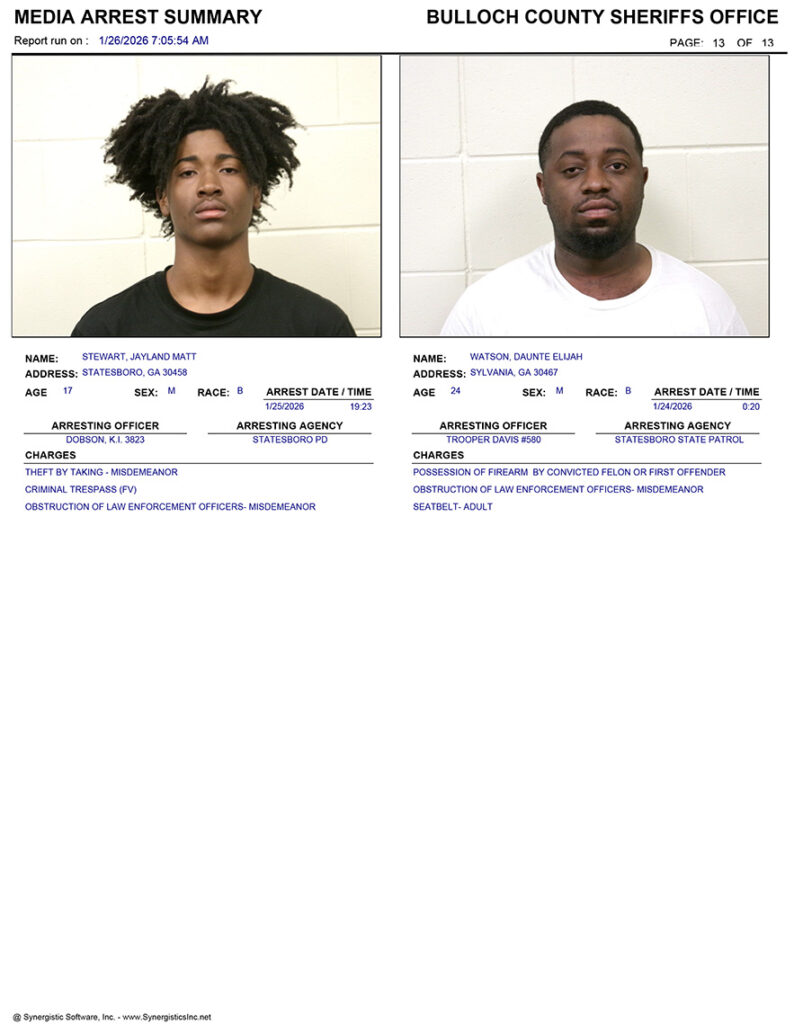 These records are matters of public information provided by the Bulloch County Sheriff’s Office. Booking reports are details of arrests only. All persons below are considered to be innocent unless proven otherwise in a court of law.