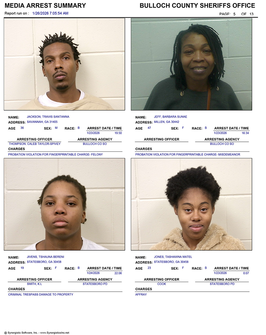 These records are matters of public information provided by the Bulloch County Sheriff’s Office. Booking reports are details of arrests only. All persons below are considered to be innocent unless proven otherwise in a court of law.