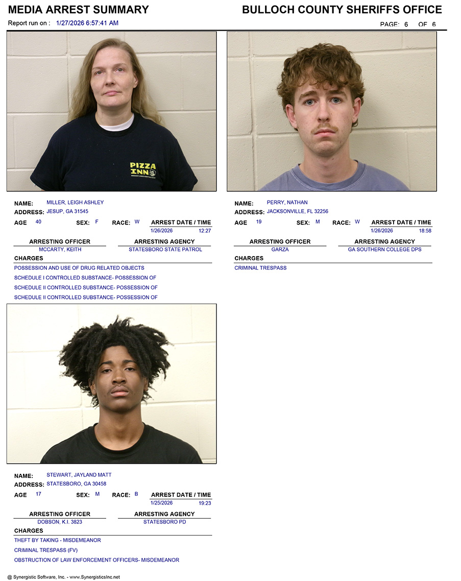 These records are matters of public information provided by the Bulloch County Sheriff’s Office. Booking reports are details of arrests only. All persons below are considered to be innocent unless proven otherwise in a court of law.