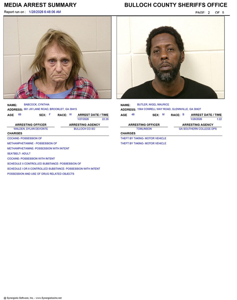 These records are matters of public information provided by the Bulloch County Sheriff’s Office. Booking reports are details of arrests only. All persons below are considered to be innocent unless proven otherwise in a court of law.