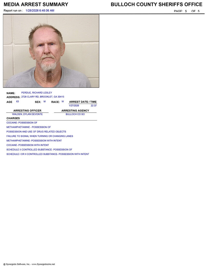 These records are matters of public information provided by the Bulloch County Sheriff’s Office. Booking reports are details of arrests only. All persons below are considered to be innocent unless proven otherwise in a court of law.