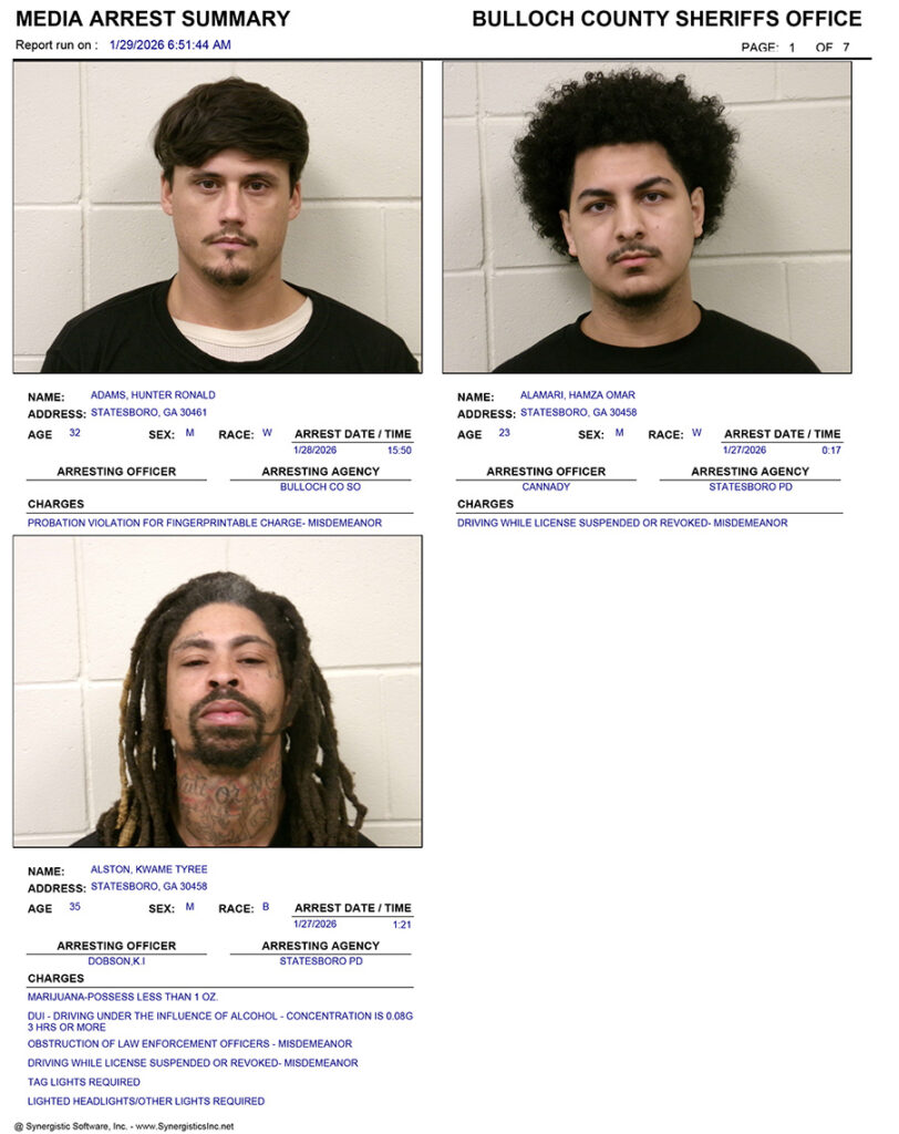 These records are matters of public information provided by the Bulloch County Sheriff’s Office. Booking reports are details of arrests only. All persons below are considered to be innocent unless proven otherwise in a court of law.