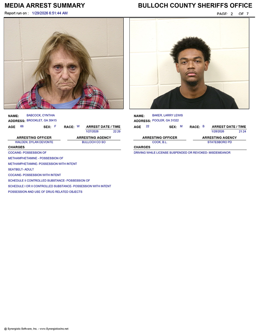 These records are matters of public information provided by the Bulloch County Sheriff’s Office. Booking reports are details of arrests only. All persons below are considered to be innocent unless proven otherwise in a court of law.