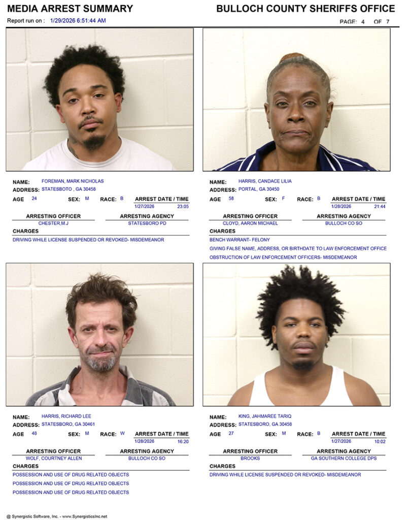 These records are matters of public information provided by the Bulloch County Sheriff’s Office. Booking reports are details of arrests only. All persons below are considered to be innocent unless proven otherwise in a court of law.