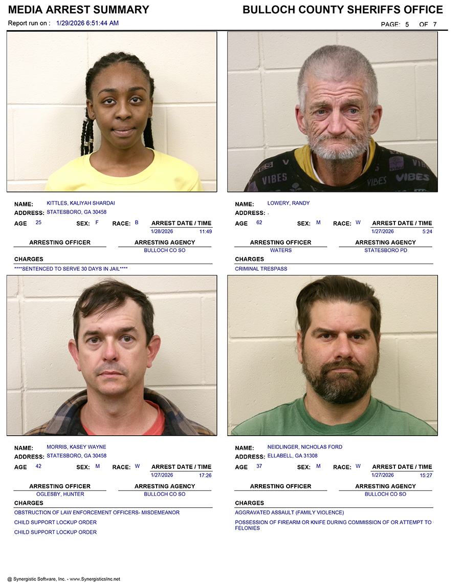 These records are matters of public information provided by the Bulloch County Sheriff’s Office. Booking reports are details of arrests only. All persons below are considered to be innocent unless proven otherwise in a court of law.